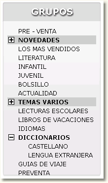 Cada grupo de libros tiene un nombre genérico que aparece en el cuadro GRUPOS. Algunos de estos grupos pueden tener grupos "hijos" que cuelgan de ellos. Estos "hijos" pueden tener a su vez otros "hijos". El sistema visualiza en los grupos que tienen subgrupos un signo + a la izquierda del nombre. Pinchando en el nombre de grupo "padre", en lugar de aparecer los libros de este grupo, aparecerán los grupos hijos. Si alguno de estos hijos tuviese a su ver sus propios subdrupos, aparecerá de nuevo el signo + . Una vez que se ven los subgrupos, el grupo "padre" tendrá el signo - .